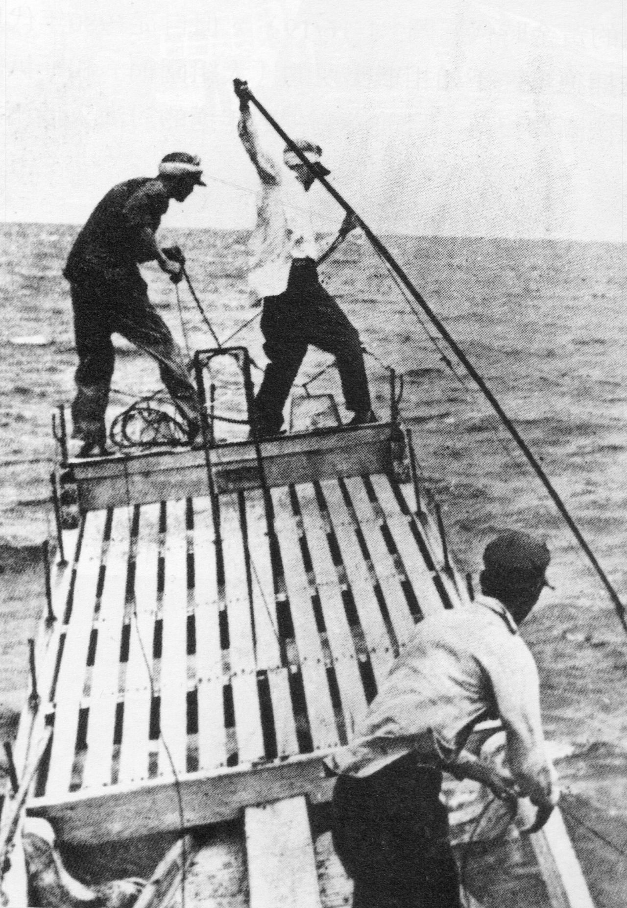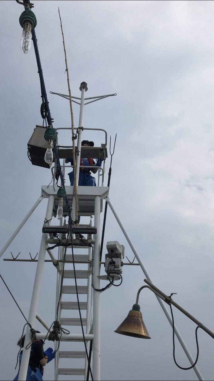 突きん棒漁とは波に揺れる舳先 へさき の突き台に立ち、突きん棒を構えてメカジキの姿を求める突き手。舵取りよりも、見張り台の上で船を操りながら、波間によぎる魚影を探す。。