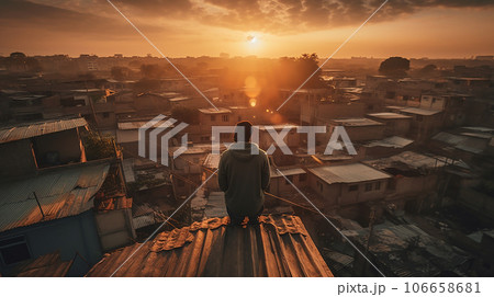 スラム街で屋根に登る男性の後ろ姿・夕方の風景のイラスト素材106658681- PIXTA。