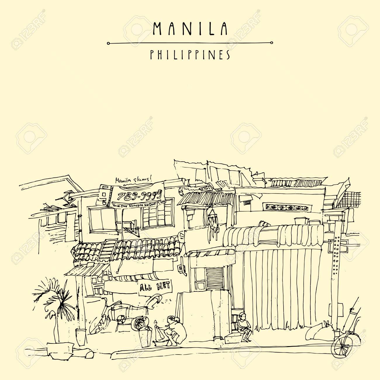 マニラ、フィリピン、アジアの古い部分のスラム街。手描き下ろしヴィンテージはがきやポスターのテンプレート ベクトルのイラスト素材・ベクター Image58714173。