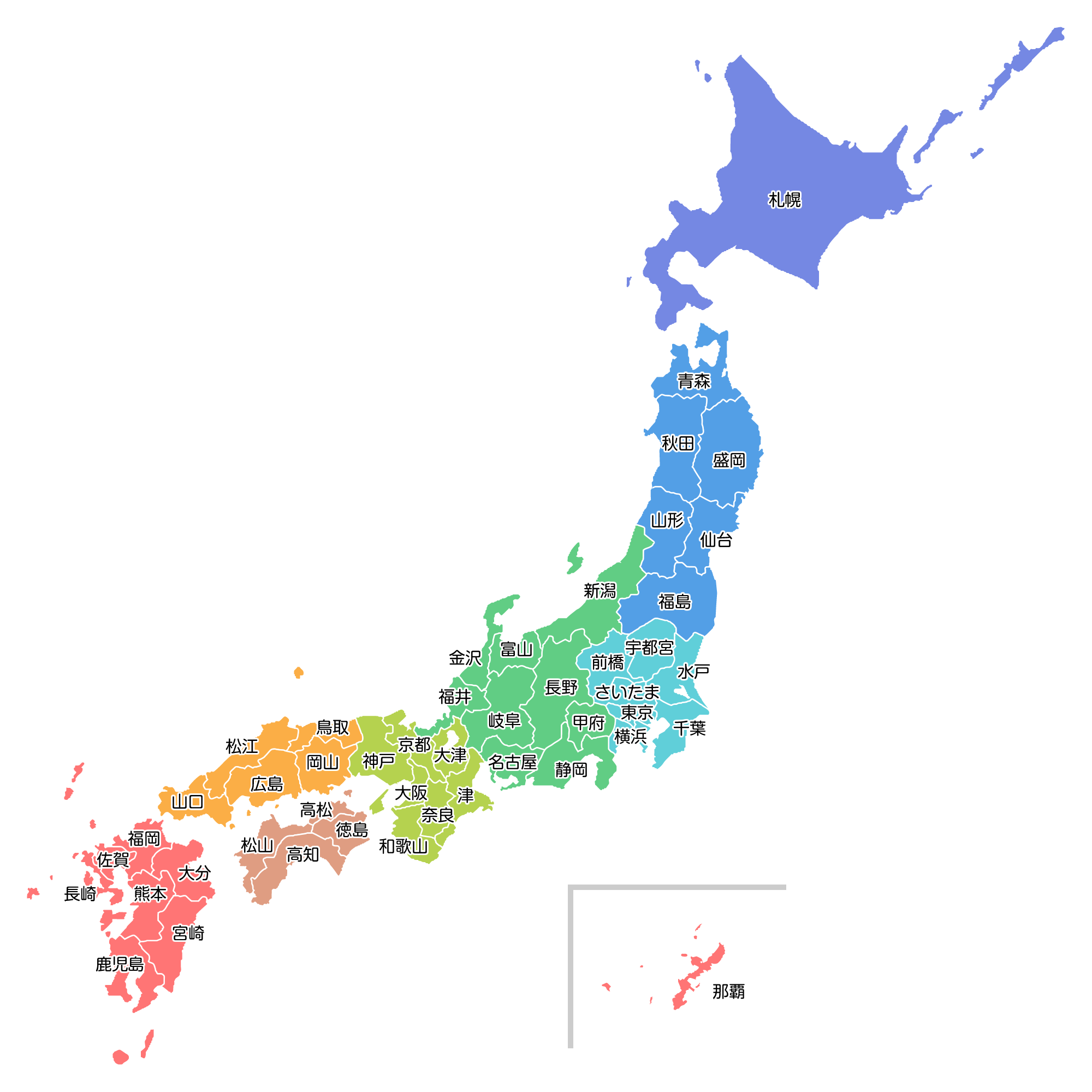 日本地図のイラスト 白地図:県庁所在地名入り。