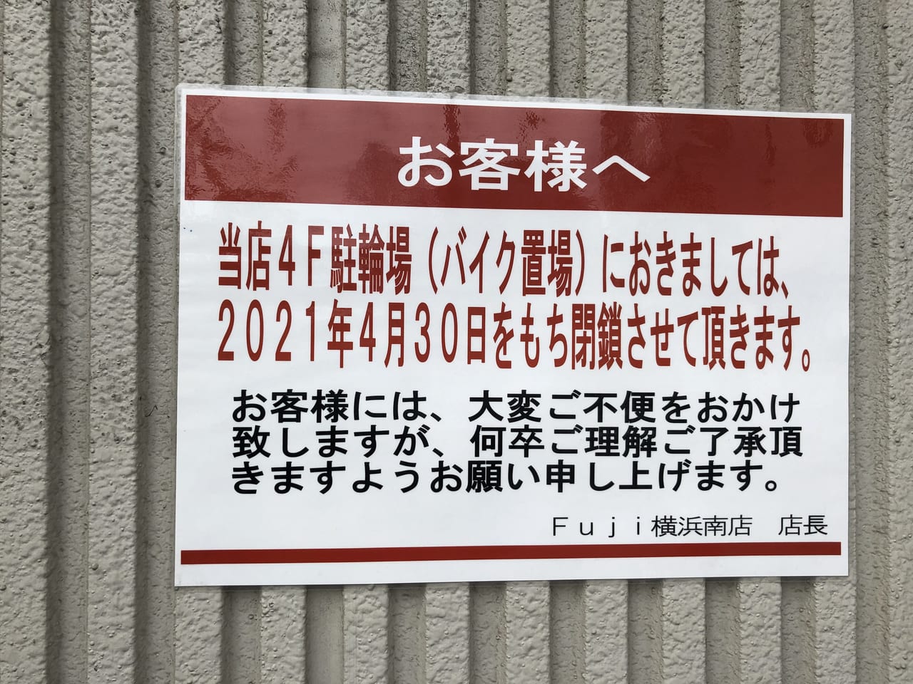 横浜市南区 南太田のフジスーパーで、4階の駐輪場が4月で閉鎖の模様!号外NET 横浜市南区。