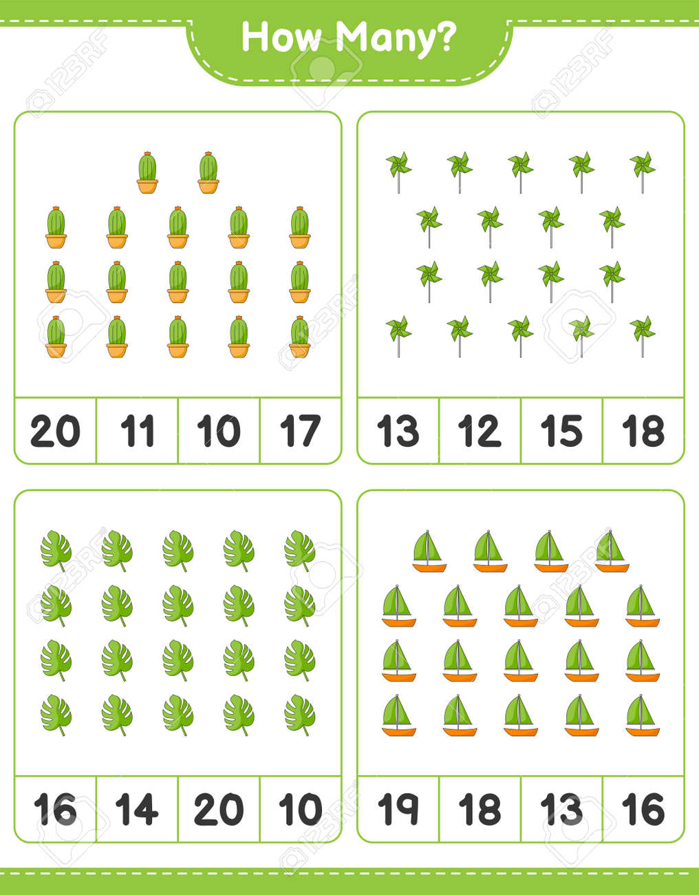 ゲームの数え方、サボテン、モンステラ、ヨット、風車の数。教育的な子供たちのゲーム、印刷可能なワークシート、ベクトル図のイラスト素材・ベクターImage 168410317。