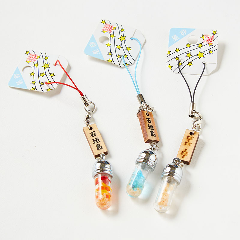 沖縄お土産 石垣島・竹富島 星の砂 小瓶 幸せの色糸ストラップ。