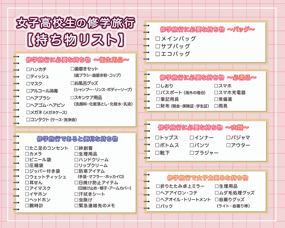 女子高校生の修学旅行、必要な持ち物は? 持ち物リスト。