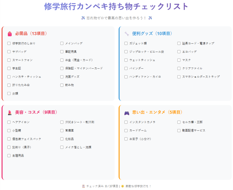 修学旅行に役立つ持ち物リストとパッキングガイド。
