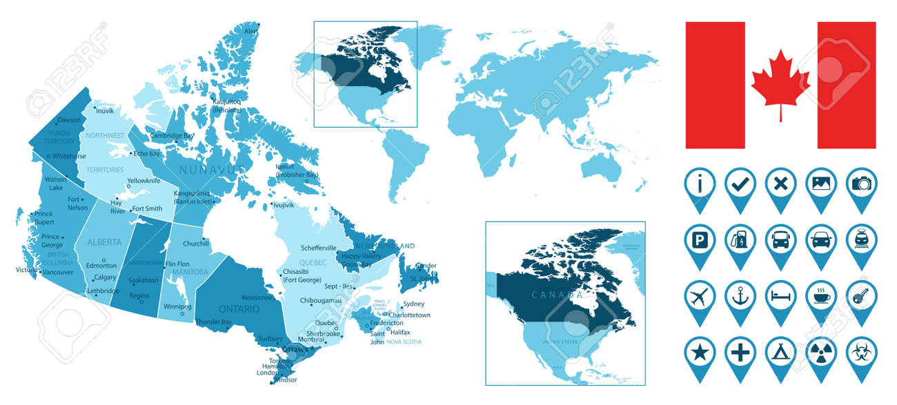 カナダは、国旗と世界地図上の場所を含む詳細な行政の青い地図です。のイラスト素材・ベクター Image 167005520。