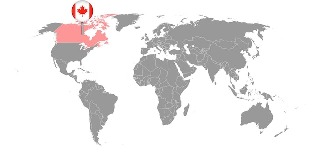 カナダ国旗のピンでマークされた世界地図上のカナダの位置。地図作成のベクターイラスト。のイラスト素材・ベクター Image 197492386。