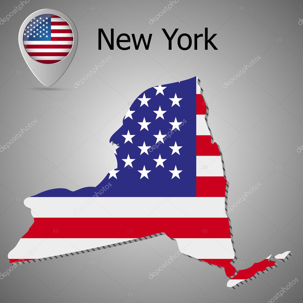 ニューヨーク州とアメリカの旗の地図。アメリカの国旗イラスト マップ ポインター。