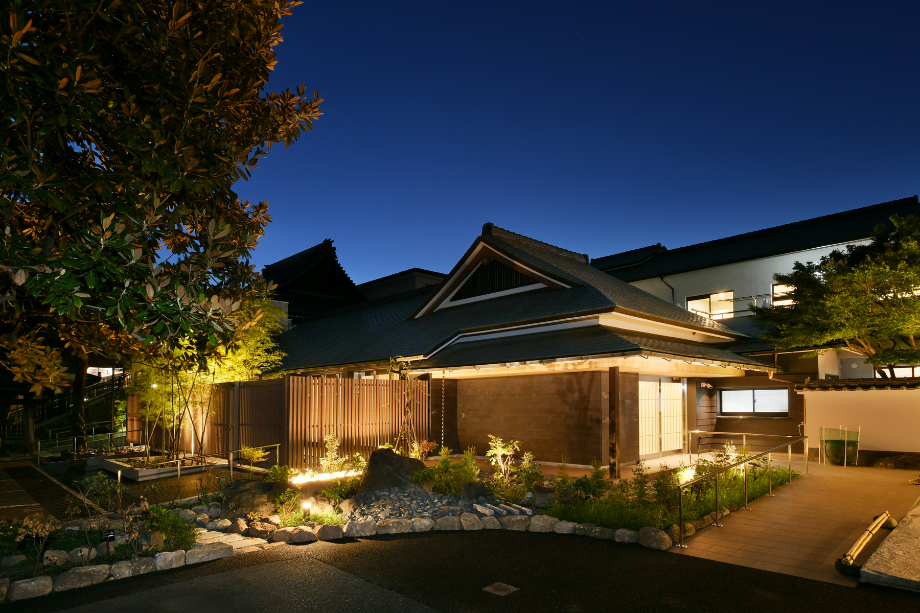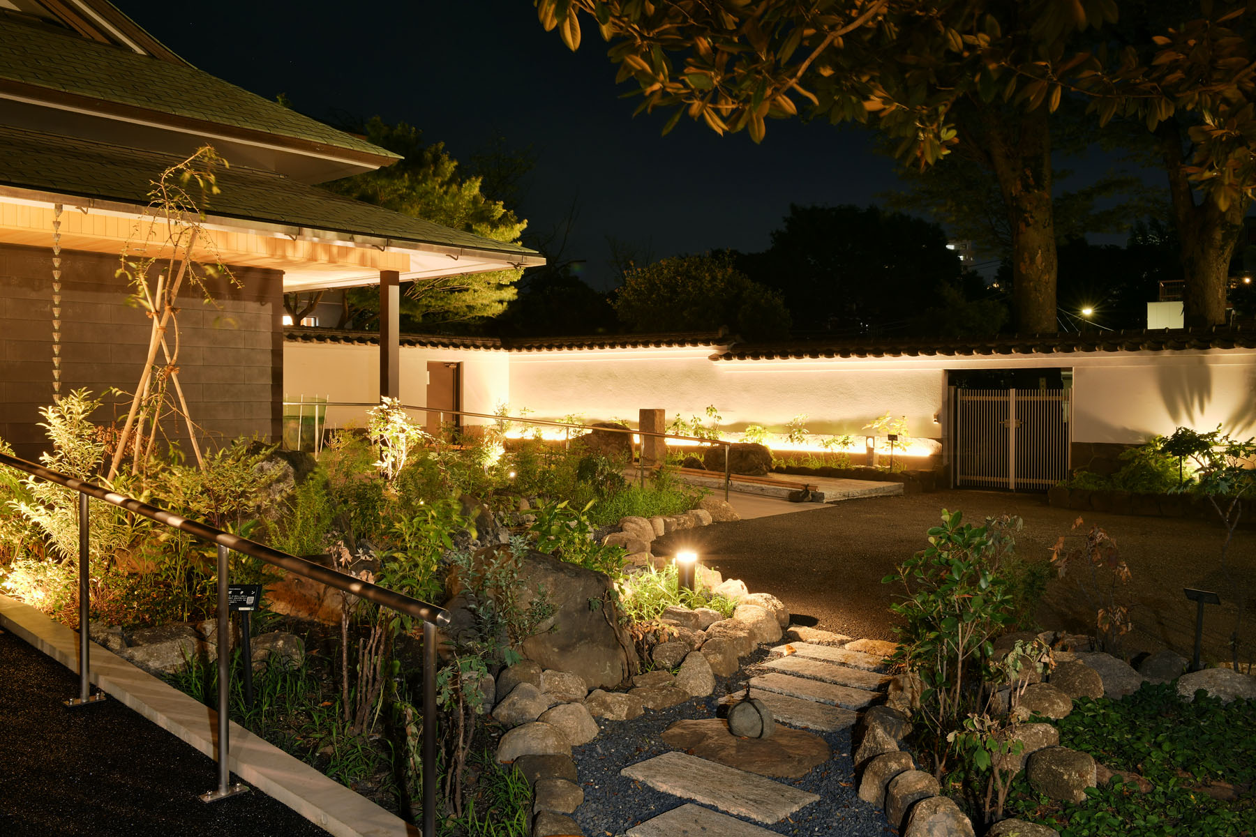 荻窪 慈雲山荻寺光明院 中央線沿いの立地でもあり、地元の方が歩く「荻の小径」から覗く外観。 夜景も美しく、気持ちよく歩ける灯りを意識しました。慈雲山荻寺光明院。