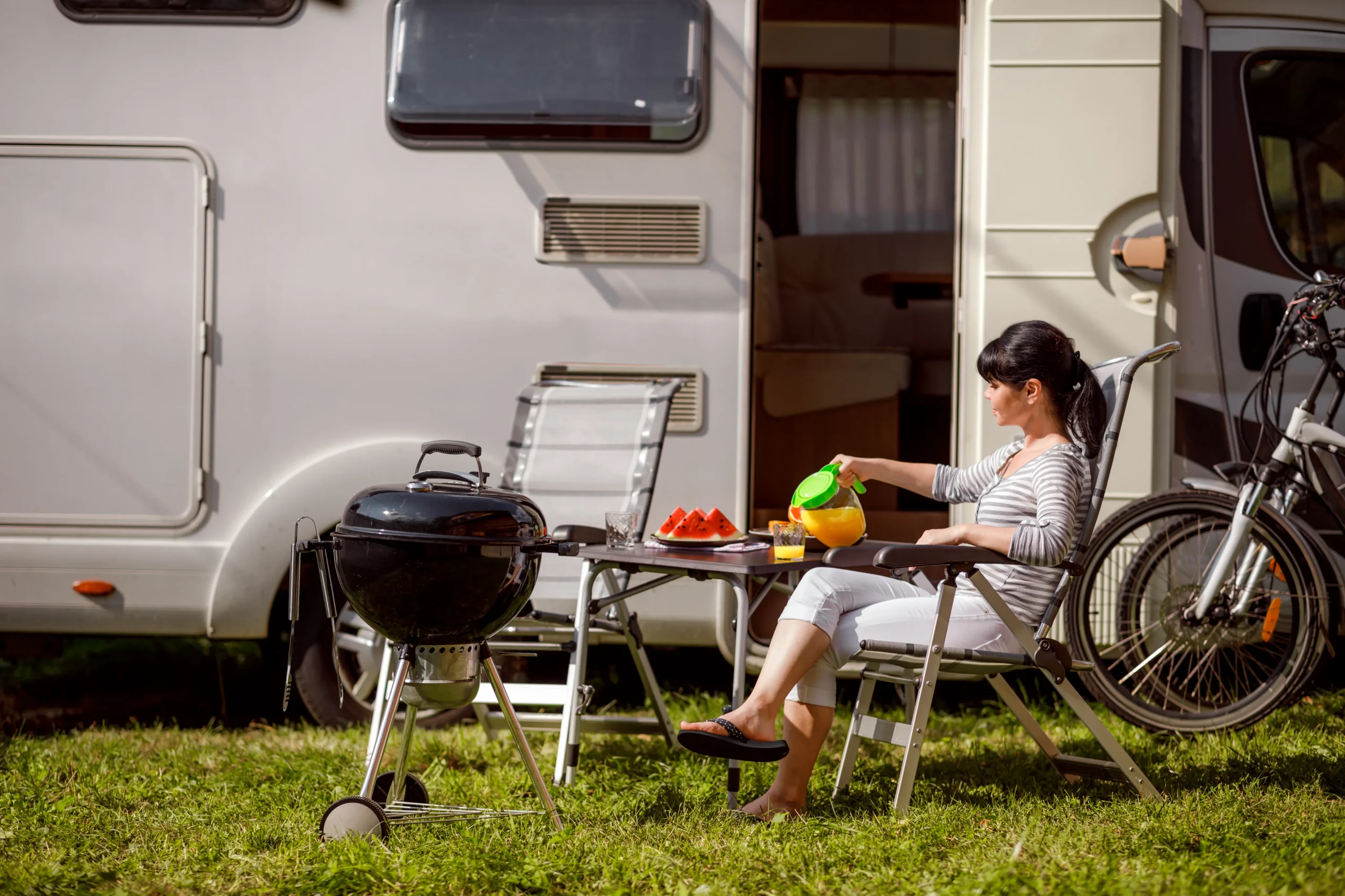 キャンプ場で休んでいる電動自転車の男と女。家族での休暇旅行します、キャンピングカー、RV キャラバン車休暇で旅行。の写真素材・画像素材 Image87394821。