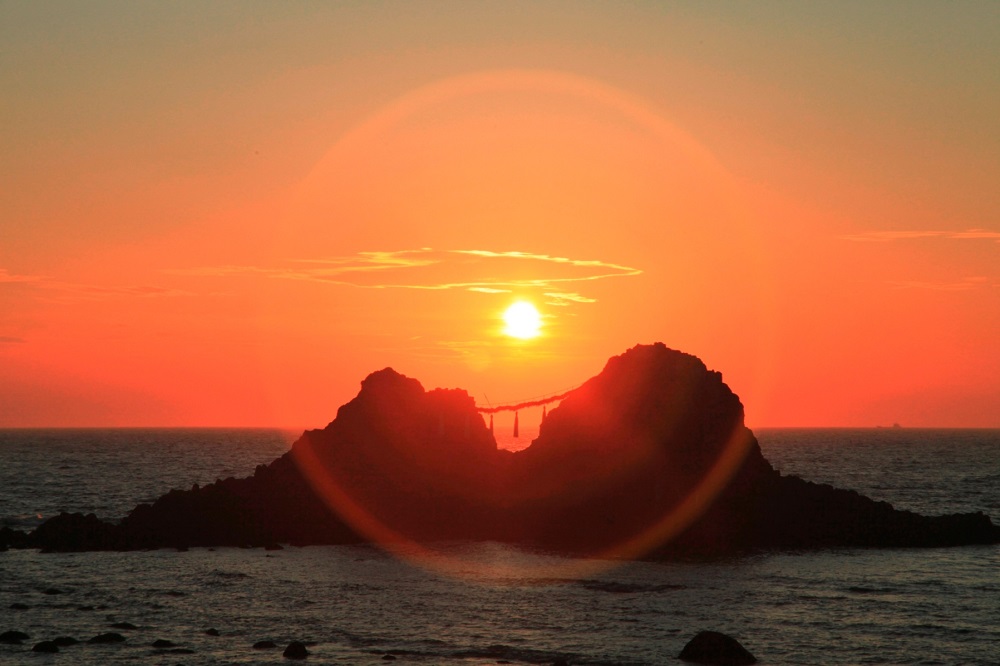 糸島観光スポット 姉子の浜の夕日二丈温泉 きららの湯。