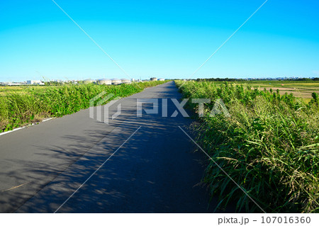 荒川河川敷のサイクリングロード 01010010992 の写真・イラスト素材アマナイメージズ。