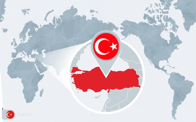 拡大されたトルコの太平洋中心の世界地図。トルコの旗と地図。Premiumベクトル素材。