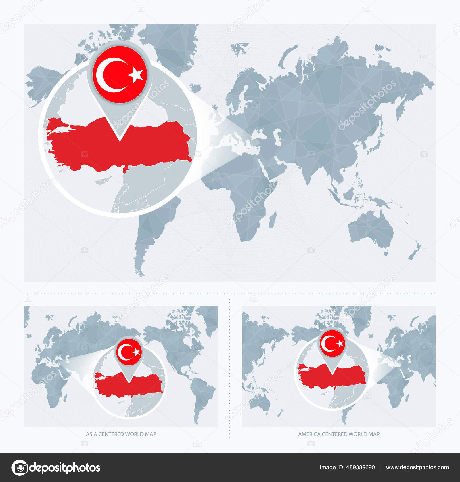 トルコを世界地図上に拡大し トルコの国旗と地図を持つ世界地図の3バージョン ストックベクター。